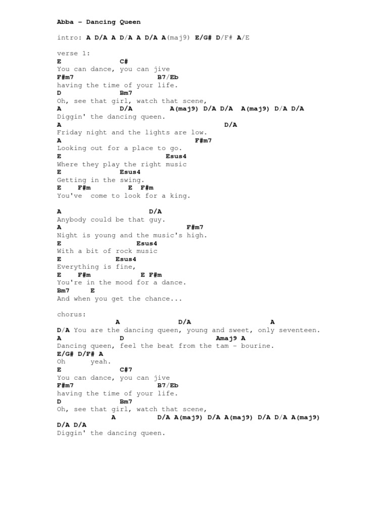 Song Lyrics With Guitar Chords For Dancing Queen